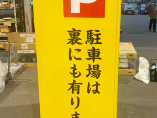 道路から見える左側面は駐車所の案内をしており、