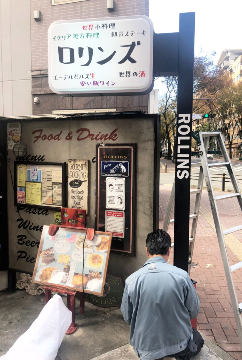 柱や電照看板の枠組みは壁面看板に合わせて黒色に塗装したり、
