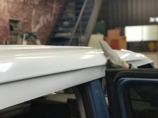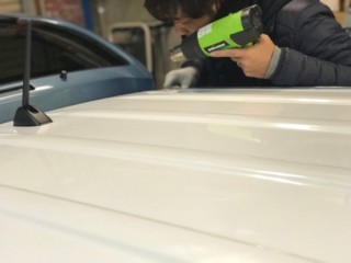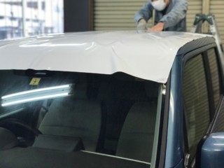 ルーフに大きなラッピングシートを広げ、