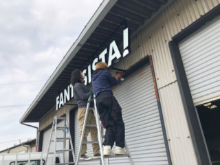 立体の文字を吊りのフレームに取り付けています。
