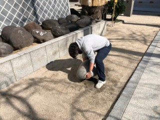 こちらの写真はうちのデザイナーが施工場所にあった試し石を持ち上げようとしている様子です。