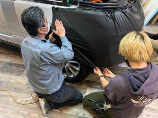 お客様の大切なお車ですのでシワが入りイメージが崩れることのないよう、二人がかりで慎重に貼っていきます。