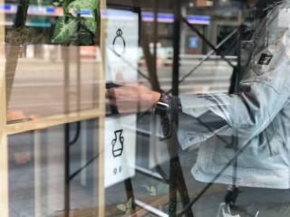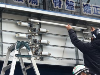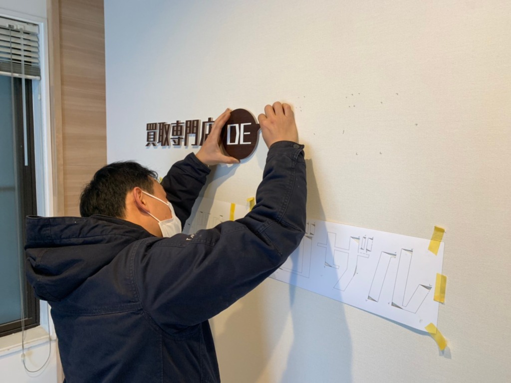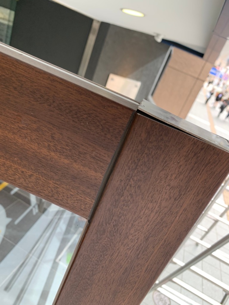 入半アクリルという看板の中のLEDライトの光を透過させる素材の上から、木目調のシートを貼り付けています。