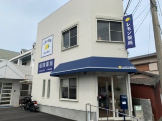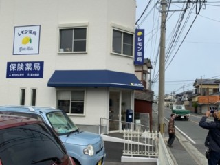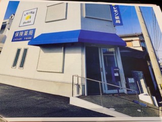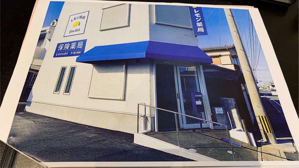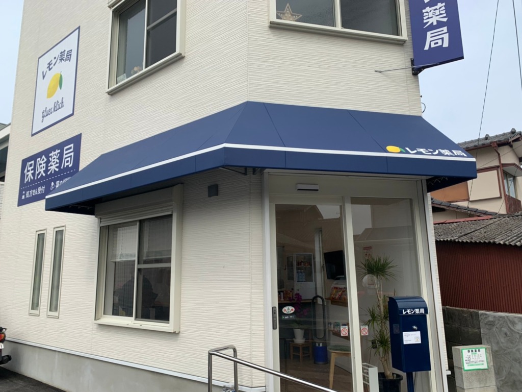 看板のお色みにあうネイビーのテントに、弊社がデザインしたレモン薬局様のロゴと、白いラインを配置しております。