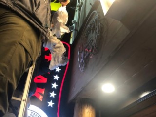 こちらの写真の中の、店舗上部にあるサインの左側のステンレス切り文字サインを店内に移動し、
