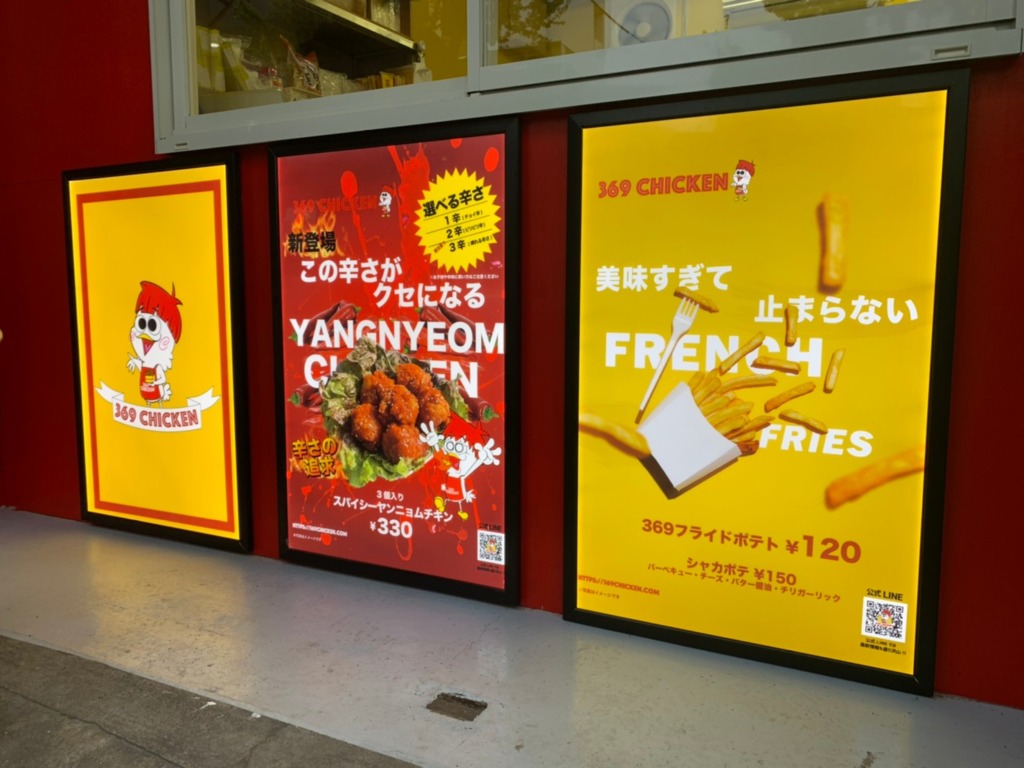 3面にシートを貼っていますので、横からみても369CHICKEN様の文字が目に入る印象的なサインですね!