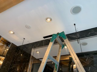 はしごを使って暖簾を取り付ける金具を設置していきます。