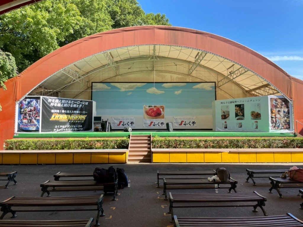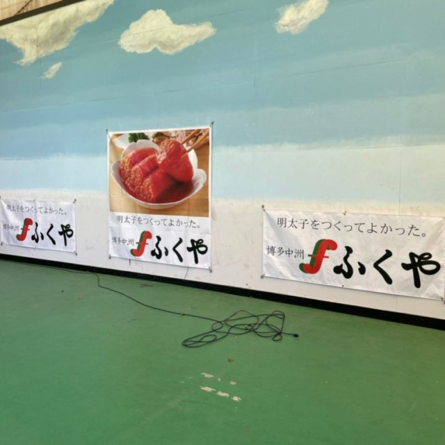 ステージ上壁面に、W2120×H880のふくやのロゴを配置したターポリンを、