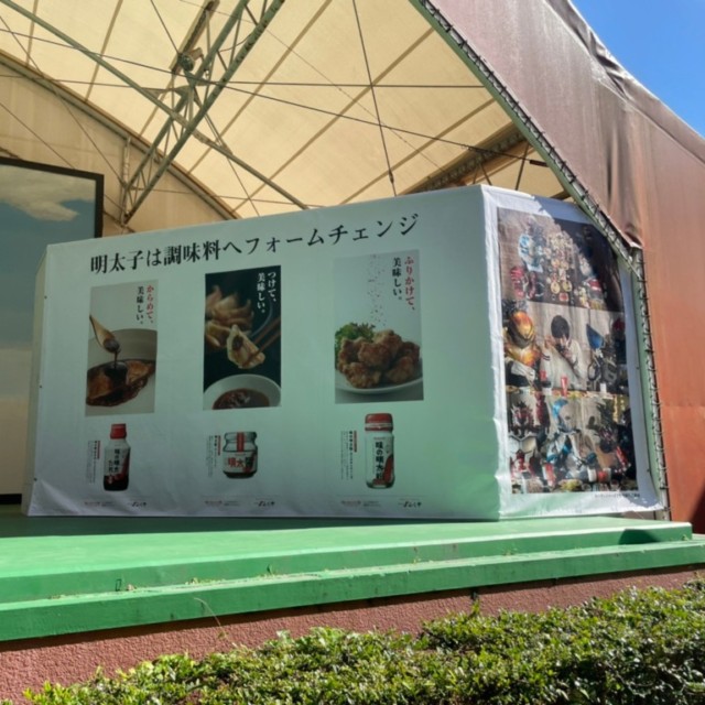 ステージ上中央に、W2000×H2000のロゴと明太子の写真を配置した