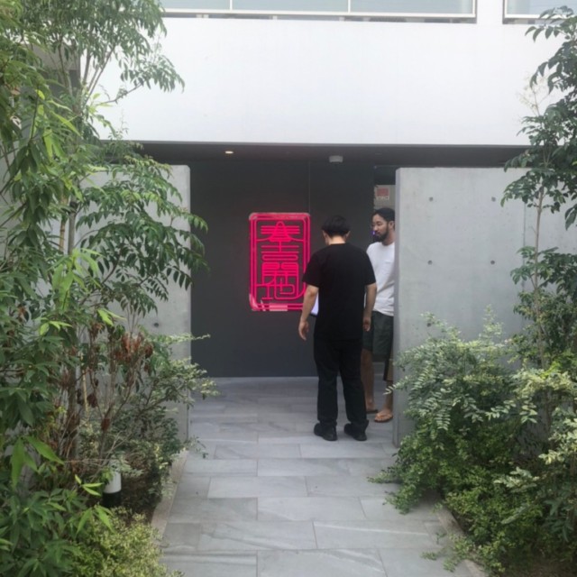 周りの緑とネオンサインの人工的な雰囲気とのコントラストが