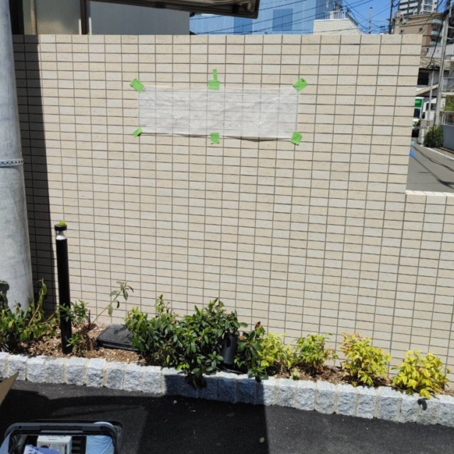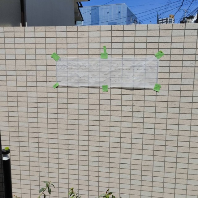 浮かし施工により壁面に文字の形の影ができていて