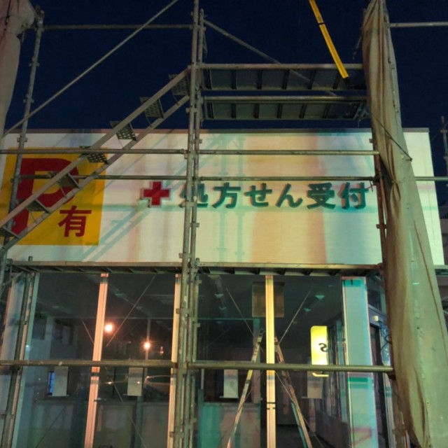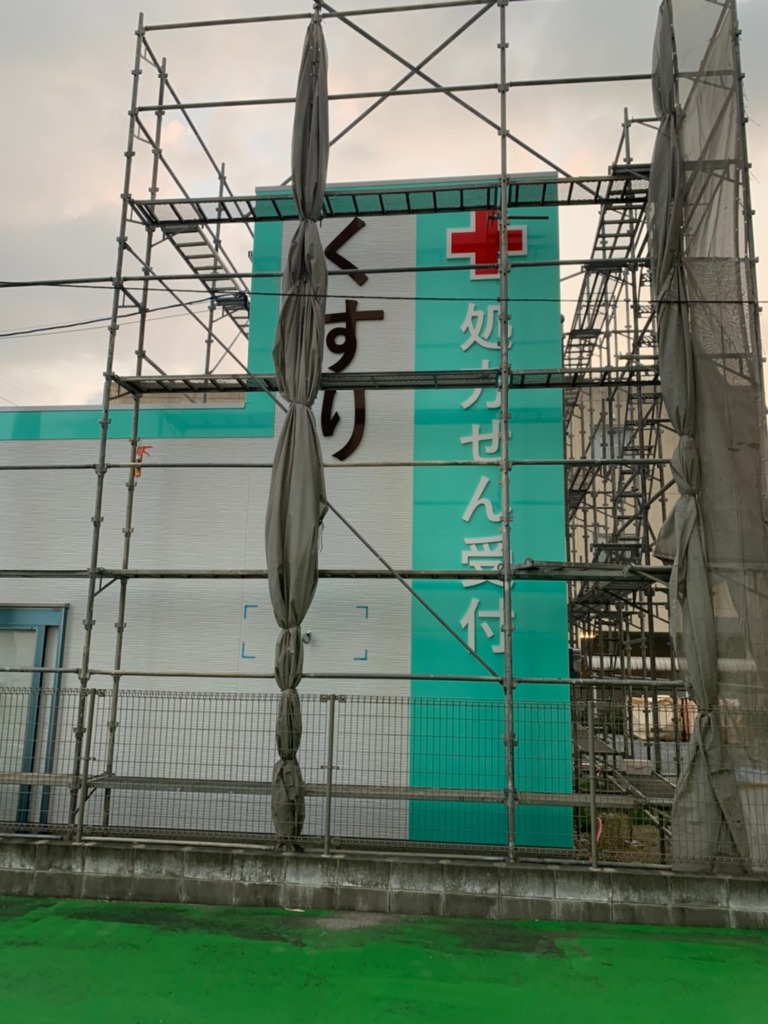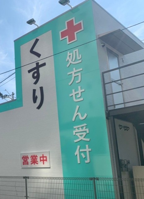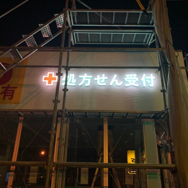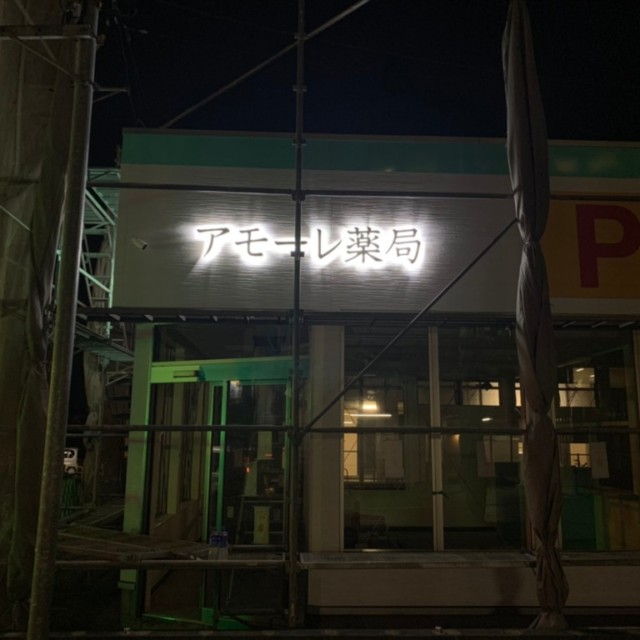 アモーレ薬局様のお名前の部分は、ステンレスチャンネル文字に