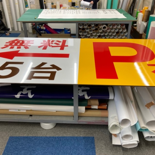 こちらの駐車場案内サインはアルミ複合板にカッティングシートを貼っています。