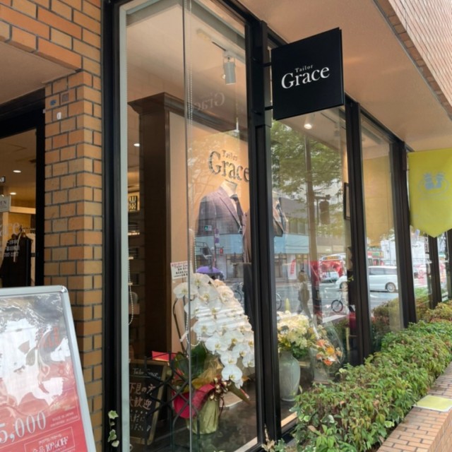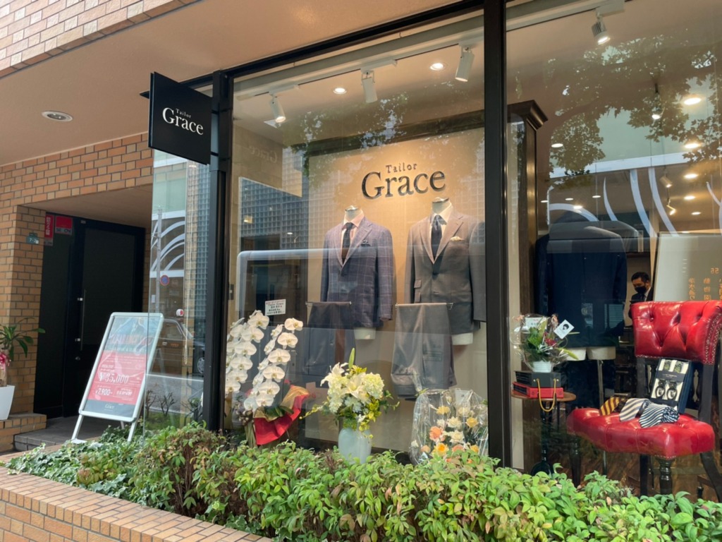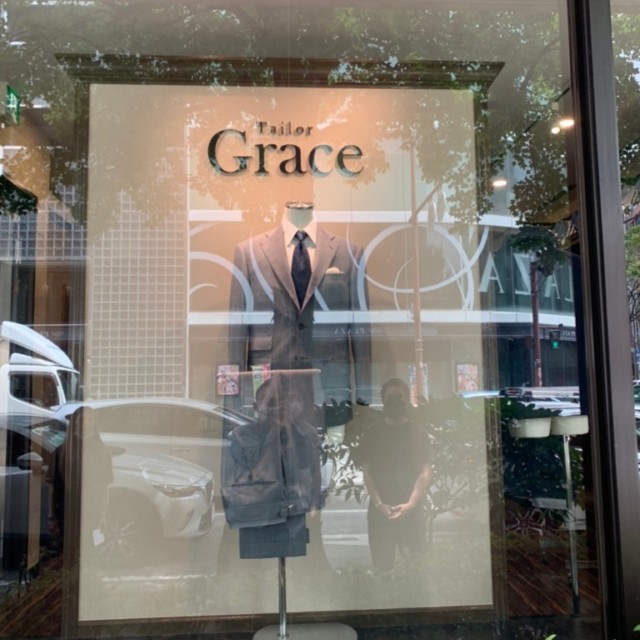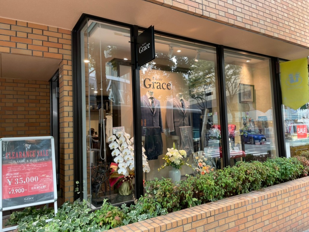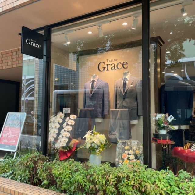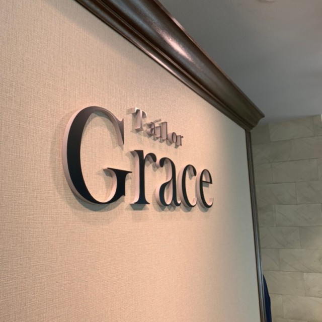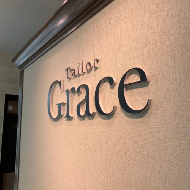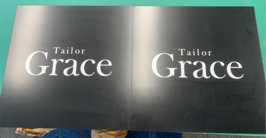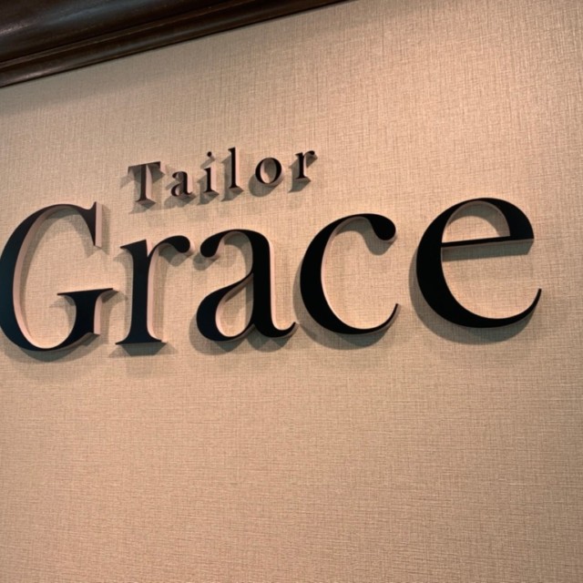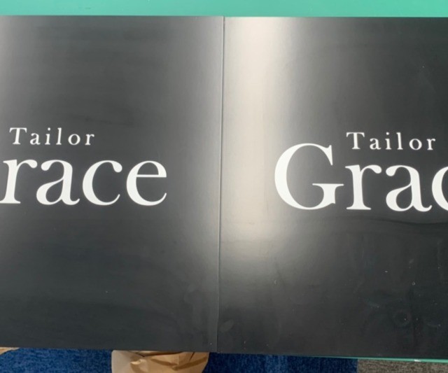 オーダースーツ専門店Tailor Grace様の袖看板と店内ショウケース内壁面サインを承りました。