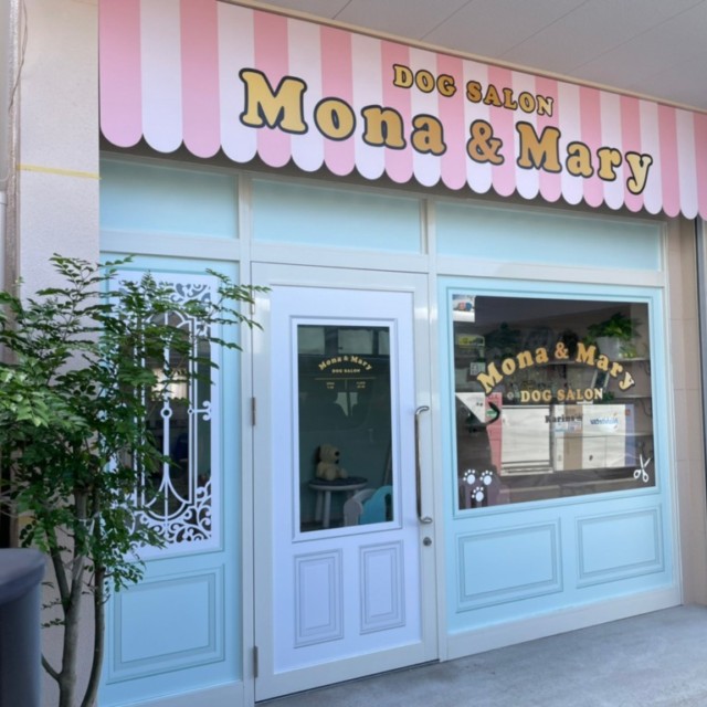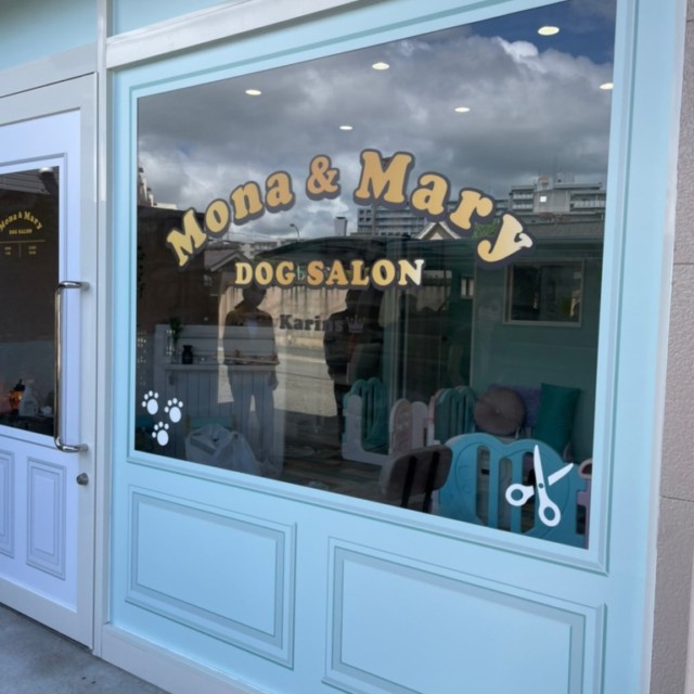 #5331 : 新店舗サイン (Dogsalon mona & mary様) WORKS DETAIL お客様名 mona & mary 施工場所 福岡市東区 業種 美容室 カテゴリー 壁面看板インクジェット出力グラフィックシート 竣工年月 ドッグサロン 福岡市東区に10月1日オープン予定Dogsalon mona & mary様の店舗プロデュース承りました。