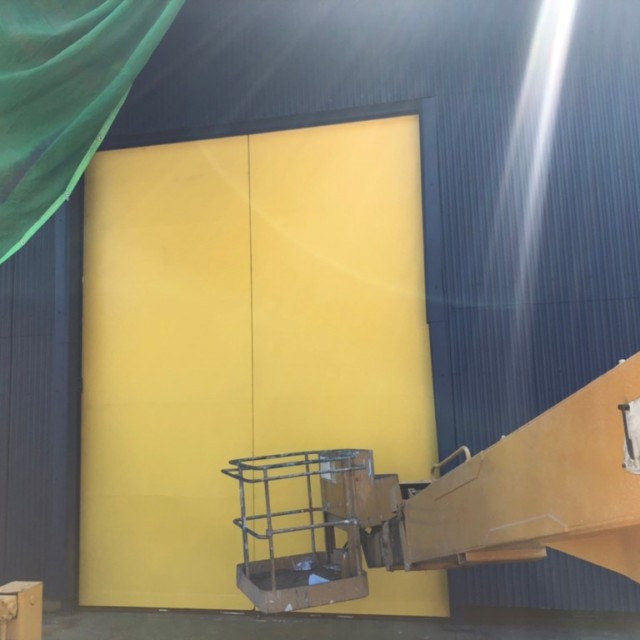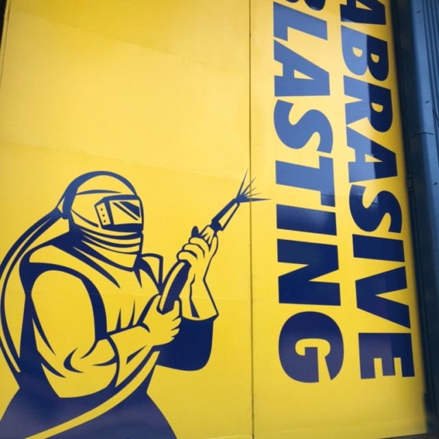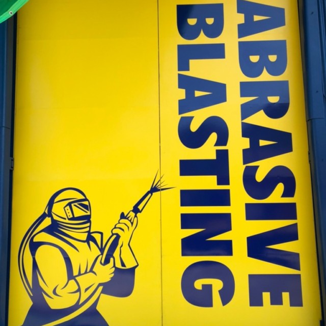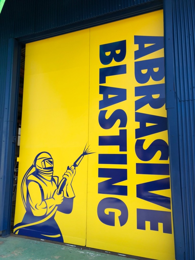 福岡県宮若市 ブラスト業務の岡垣工業様より工場扉サイン施工をうけたまわりました。