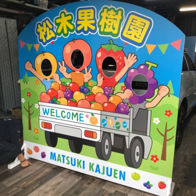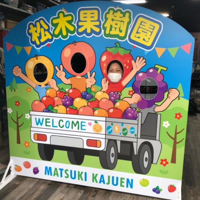 #5519:顔出しパネル製作(松木果樹園様) WORKS DETAIL お客様名 松木果樹園様 施工場所 京都郡みやこ町 業種 ショップ・店舗 カテゴリー パネル 竣工年月 2021/10 京都郡みやこ町犀川大坂 松木果樹園様の顔出しパネル製作させて頂きました。