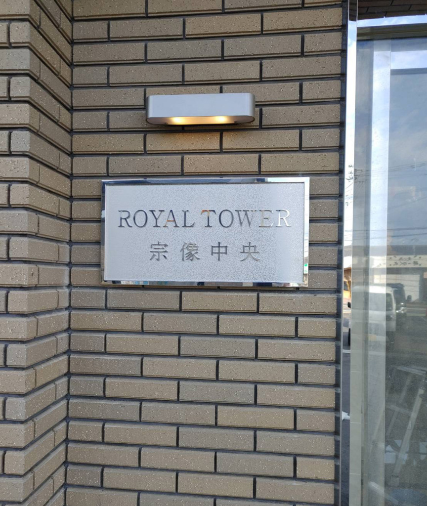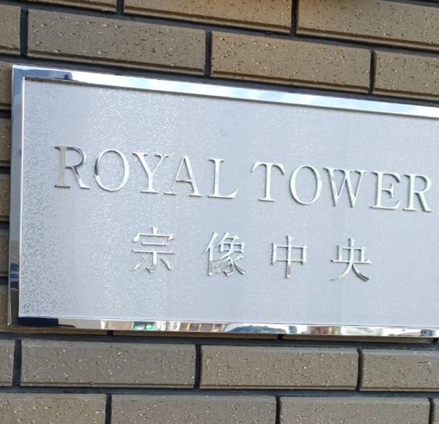 #5437:館銘板製作施工(ROYAL TOWER様) WORKS DETAIL お客様名 ROYAL TOWER様 施工場所 宗像市 業種 ホテル・マンション カテゴリー 各種切文字(カルプ/アルミ複合板/アクリル/金属)プレートサイン(エッチング/館銘板) 竣工年月 2021年12月 ROYAL TOWER様よりマンションの館銘板製作施工を承りました。