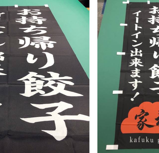 #6012:新店舗サイン製作施工(家福様) WORKS DETAIL お客様名 家福様 施工場所 福岡市早良区 業種 飲食店 カテゴリー インクジェット出力ターポリン幕・旗・のぼり電照サイン(正面発光/背面発光/側面発光)各種切文字(カルプ/アルミ複合板/アクリル/金属)ポール看板/袖看板 竣工年月 2022年1月 家福様より新店舗サイン製作施工を承りました。 餃子屋さんが新規OPENにて屋外用上部サインと袖看板(電照)です。 【 袖看板施工前と施工完了 】 追加で、のぼりも承りました。