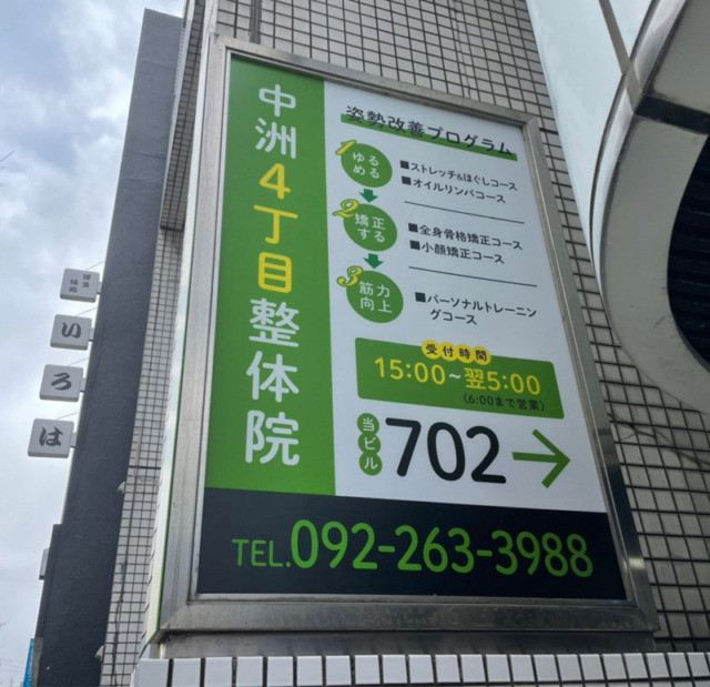 #6048:店舗サイン製作施工(中洲4丁目整体院様) WORKS DETAIL お客様名 中洲4丁目整体院様 施工場所 福岡市博多区 業種 ショップ・店舗 カテゴリー 電照サイン(正面発光/背面発光/側面発光)各種切文字(カルプ/アルミ複合板/アクリル/金属)ポール看板/袖看板 竣工年月 2022年2月 中洲4丁目整体院様より店舗サイン製作施工を承りました。