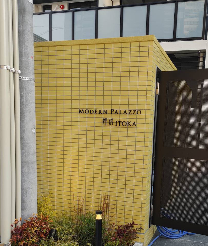 #6288:ステンレス切文字サイン製作施工(モダンパラッツォ姪浜itoka様) WORKS DETAIL お客様名 モダンパラッツォ姪浜itoka様 施工場所 福岡市西区 業種 ホテル・マンション カテゴリー 各種切文字(カルプ/アルミ複合板/アクリル/金属) 竣工年月 2022年3月 モダンパラッツォ姪浜itoka様よりマンション入り口のステンレス切文字サイン製作施工を承りました。 仕上げ:ステンレス 焼付け塗装(半ツヤ黒)加工
