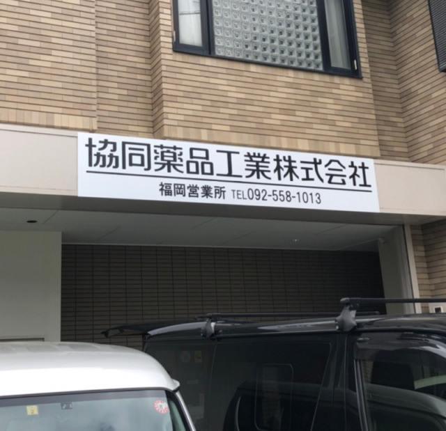 ♯8161 営業所サイン アルミ複合板仕様 製作施工:協同薬品工業株式会社様 WORKS DETAIL お客様名 協同薬品工業株式会社 施工場所 福岡県福岡市中央区 業種 オフィス・工場 カテゴリー 壁面看板 竣工年月 2023.02 富山の売薬として江戸時代から親しまれてきた協同薬品工業株式会社 様 今回 福岡営業所様 サインを承りました。