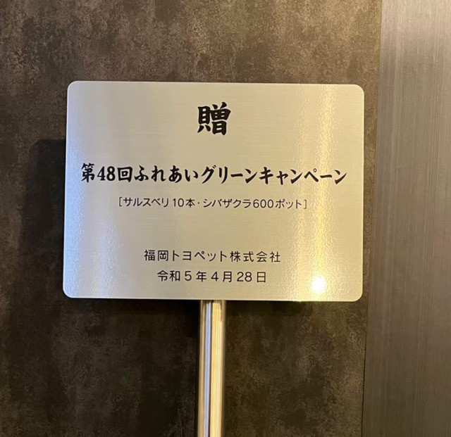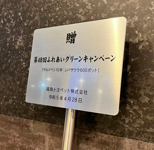 #8613:記念植樹プレート製作(福岡トヨペット株式会社様) WORKS DETAIL お客様名 福岡トヨペット株式会社様 施工場所 福岡県飯塚市 業種 ショップ・店舗オフィス・工場その他 カテゴリー プレートサイン(エッチング/館銘板) 竣工年月 2023年4月 福岡トヨペット株式会社様より記念植樹プレート製作を承りました。