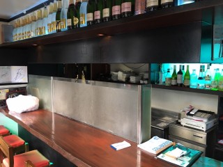 ご相談前の調理場の奥はブルーのシートを使用し海の中を演出、またカウンターのガラスはフォグラスを貼ってありました。