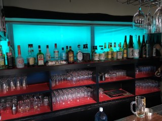 カウンターのフォグラスは剥がし、お客様の希望をここにも。上の棚にはカッティングシートで店名を追加しました。