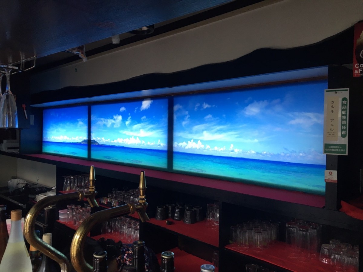 海の中をイメージした雰囲気にされたいというご要望でしたので、電照用インクジェット出力で、まるで海を眺めているような演出。元々あった枠も窓枠と思わせるようなデザインにしました。