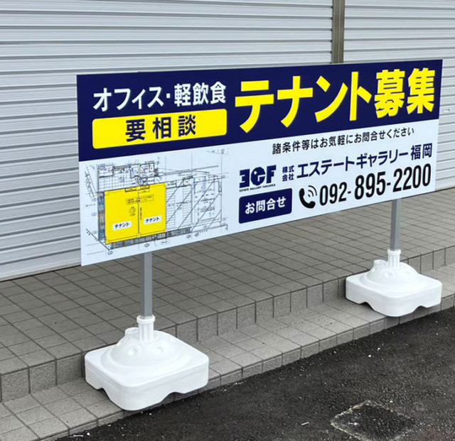 #8978:テナント告知看板制作(エステートギャラリー福岡様) WORKS DETAIL お客様名 エステートギャラリー福岡様 施工場所 業種 オフィス・工場 カテゴリー アルミ複合板+インクジェット出力自立看板/野立看板 竣工年月 2023年6月 エステートギャラリー福岡様よりテナント告知看板制作を承りました。 誘導に大活躍の告知・宣伝用看板。テナント決定後は、移動もしやすい注水台を今回使用しております。
