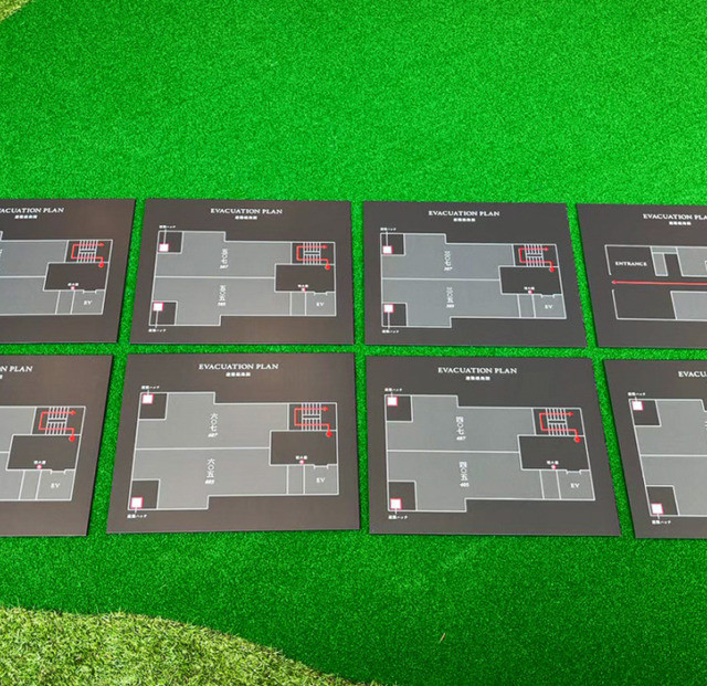 #8696:避難経路図(春重本館様) WORKS DETAIL お客様名 春重本館様 施工場所 福岡市博多区 業種 ホテル・マンション カテゴリー アルミ複合板+インクジェット出力パネル施設内サイン(ピクトグラム/室名札/案内サイン) 竣工年月 2023年7月 春重本館様より避難経路図製作を承りました。