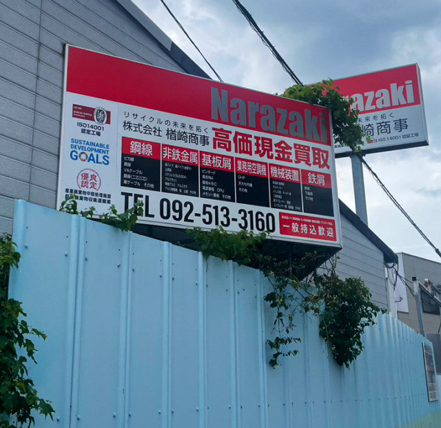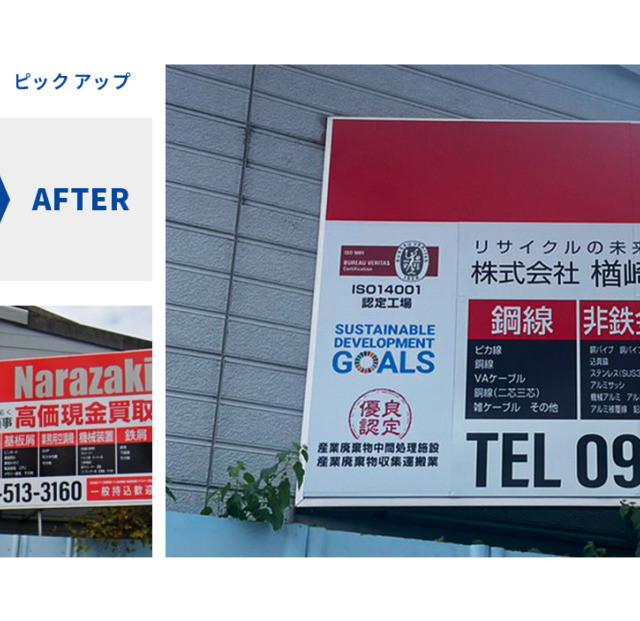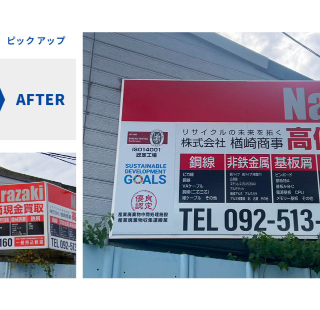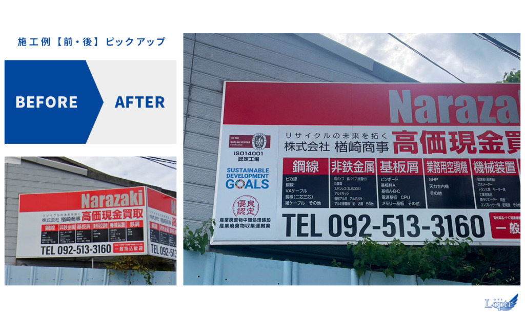 #9027:サイン製作施工(楢崎商事様) WORKS DETAIL お客様名 楢崎商事様 施工場所 福岡市博多区 業種 オフィス・工場 カテゴリー カッティングシートアルミ複合板+インクジェット出力 竣工年月 2023年7月 楢崎商事様より一部サイン製作(上貼り)施工を承りました。 【優良認定マーク】 【自立サイン】上貼り 【L字型サイン:認定】 【施工前・施工後】