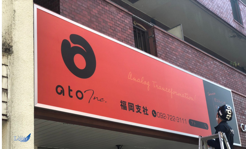 #7495:サイン製作施工(ato福岡支社様) WORKS DETAIL お客様名 ato福岡支社様 施工場所 福岡市中央区 業種 オフィス・工場 カテゴリー 壁面看板インクジェット出力アルミ複合板+インクジェット出力 竣工年月 2022年10月 ato福岡支社様よりサイン製作施工を承りました。 【施工完了】 【施工中】