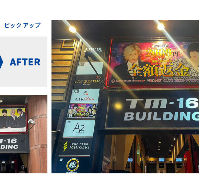 #9782:店舗サイン製作施工(CLUB REED Fukuoka様) WORKS DETAIL お客様名 CLUB REED Fukuoka様 施工場所 福岡市博多区 業種 飲食店 カテゴリー 壁面看板インクジェット出力アルミ複合板+インクジェット出力 竣工年月 2023年10月 CLUB REED Fukuoka様より既存看板の貼替製作施工を承りました。 【左:施工前 右:施工完了】 【施工中】