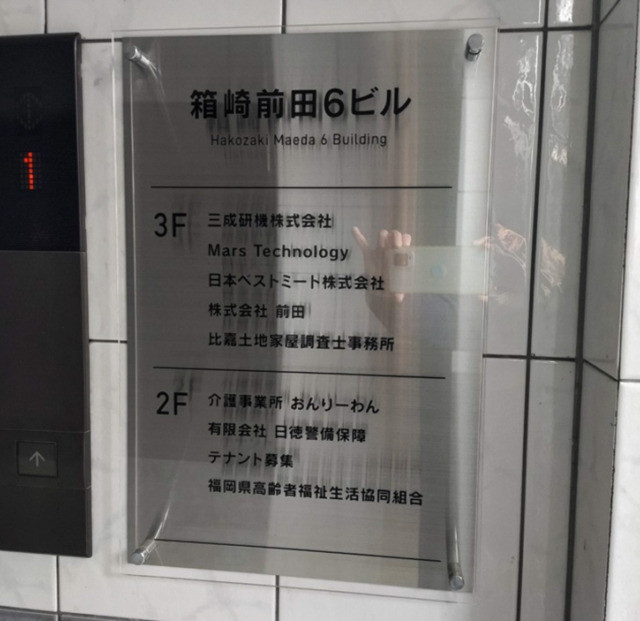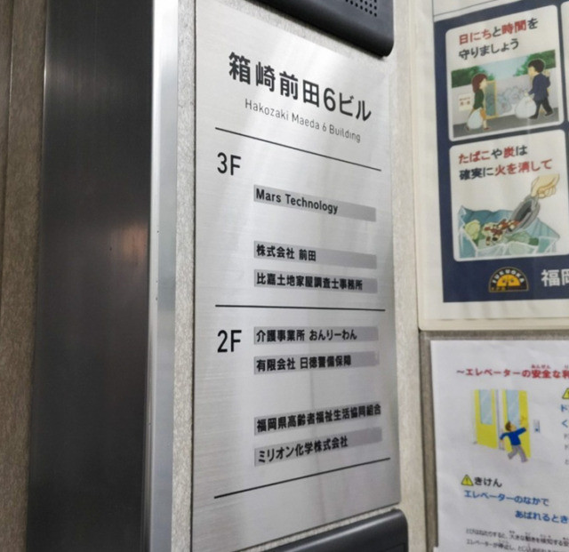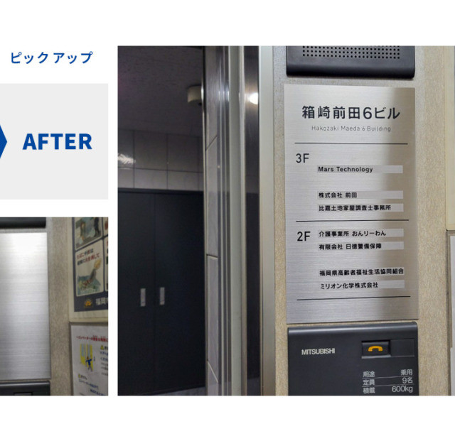 #9723:ビルEVサイン製作施工(前田ビル様) WORKS DETAIL お客様名 前田ビル様 施工場所 福岡市東区 業種 ホテル・マンション カテゴリー カッティングシート 竣工年月 2023年11月 前田ビル様よりビルEV、エントランスサイン製作施工を承りました。 【EV横フロア案内】 【EV内フロア案内】 【左:施工前 右:施工完了】