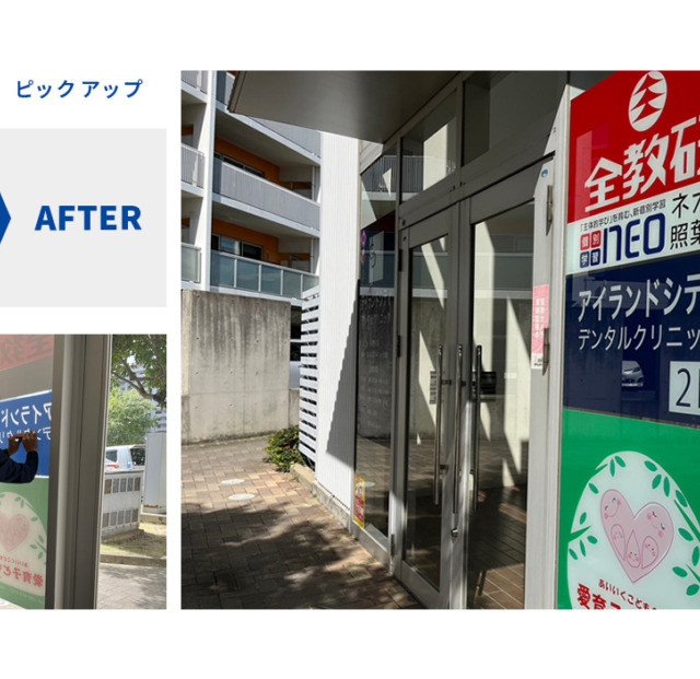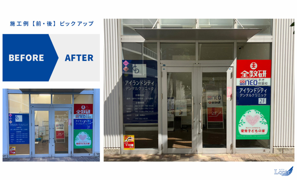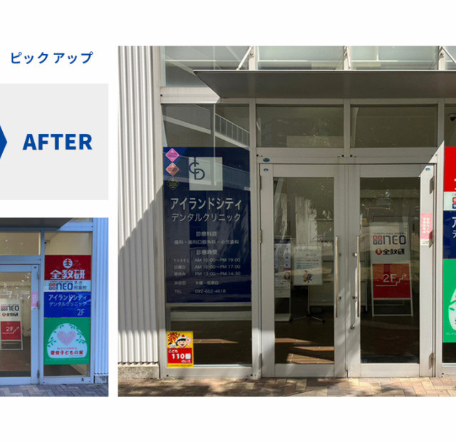 #9619:ガラス面シート貼替製作施工(アイランドシティデンタルクリニック様) WORKS DETAIL お客様名 アイランドシティデンタルクリニック様 施工場所 福岡市東区香椎 業種 病院・クリニック カテゴリー ウィンドウグラフィックスインクジェット出力 竣工年月 2023年9月 アイランドシティデンタルクリニック様よりガラス面シート貼替製作施工を承りました。 【左:施工前 右:施工完了】