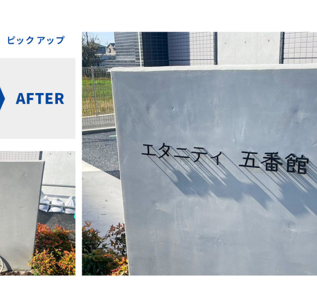 #9012:ステンレス切文字サイン(エタニティ五番館様) WORKS DETAIL お客様名 エタニティ五番館様 施工場所 福岡県福津市 業種 ホテル・マンション カテゴリー 各種切文字(カルプ/アルミ複合板/アクリル/金属) 竣工年月 2023年11月 エタニティ五番館様より切文字サイン製作施工を承りました。 仕様:ステンレス切文字サイン 仕上げ:焼付け塗装(黒半ツヤ) 【左:施工前 右:施工完了】