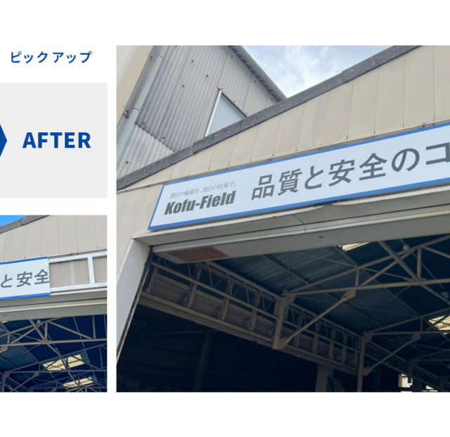 #7629:上部サイン多雨風被害修復製作施工(コウフ・フィールド様) WORKS DETAIL お客様名 コウフ・フィールド様 施工場所 福岡市博多区 業種 オフィス・工場 カテゴリー 壁面看板アルミ複合板+インクジェット出力 竣工年月 2022年10月 コウフ・フィールド様より上部サイン多雨風被害修復製作施工を承りました。 【左:施工前 右:施工完了】