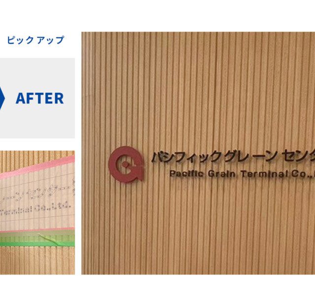 #9671:オフィスサイン製作施工(パシフィックグレーンセンター様) WORKS DETAIL お客様名 パシフィックグレーンセンター様 施工場所 業種 オフィス・工場 カテゴリー ウィンドウグラフィックス各種切文字(カルプ/アルミ複合板/アクリル/金属) 竣工年月 パシフィックグレーンセンター様よりオフィスサイン製作施工を承りました。 【左:施工前 右:施工完了】 【左:施工前 右:施工完了】