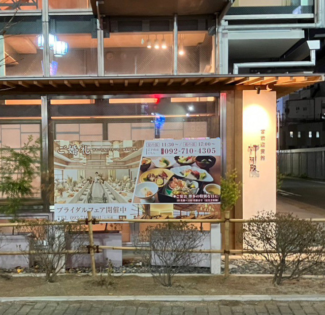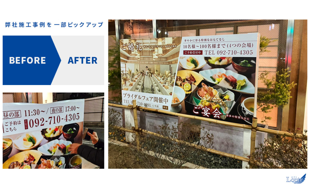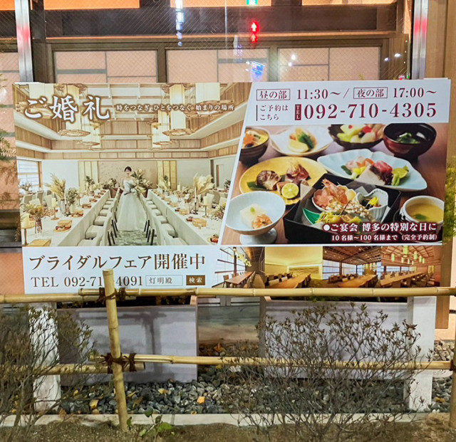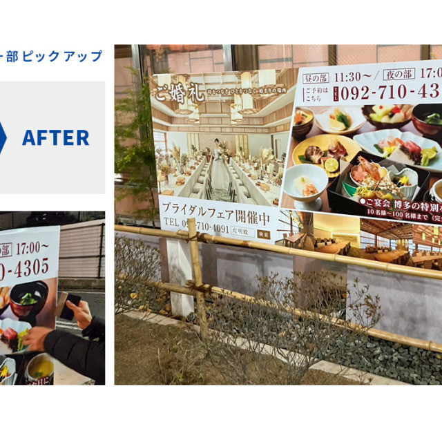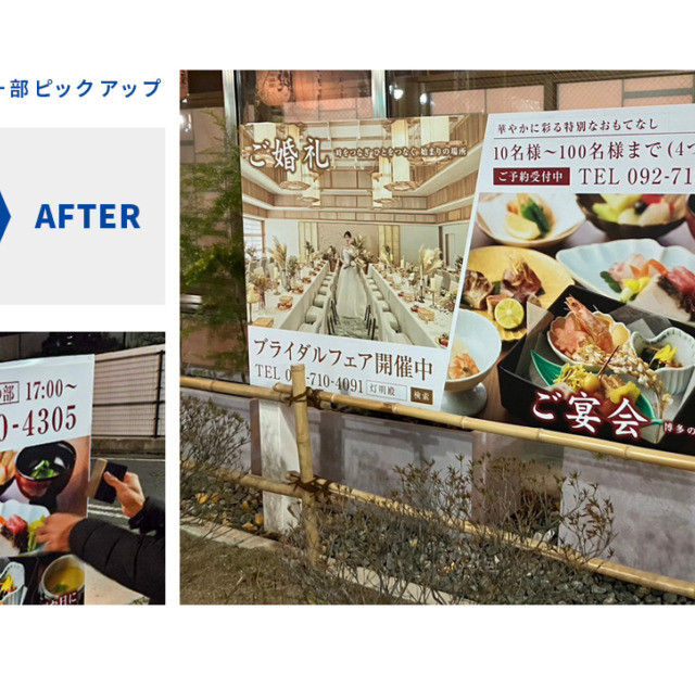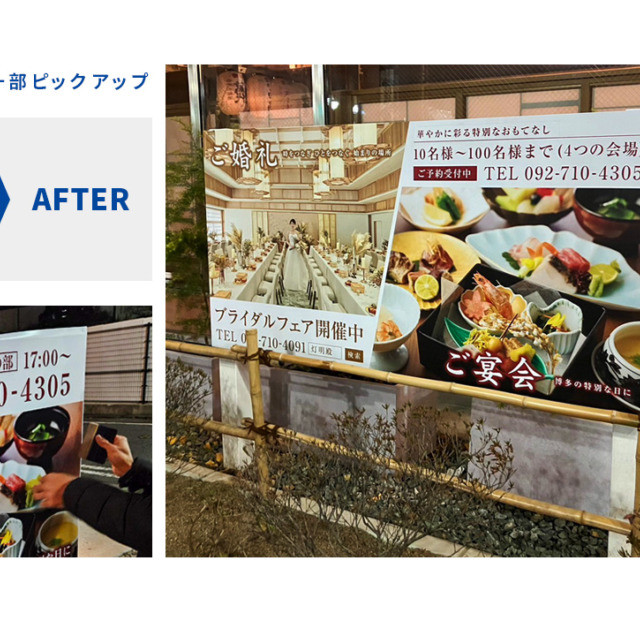 #10079:灯明殿板面表示製作(宮前迎賓館 様) WORKS DETAIL お客様名 宮前迎賓館 様 施工場所 福岡市博多区 業種 ショップ・店舗飲食店 カテゴリー インクジェット出力自立看板/野立看板 竣工年月 2023年12月 櫛田神社の北神門に隣接する宮前迎賓館 様より灯明殿の変更を承りました。 今回の仕様:塩ビインクジェット出力 【右:施工中 左:施工完了】