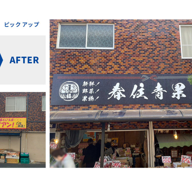 #9826:春住青果様 WORKS DETAIL お客様名 春住青果様 施工場所 福岡市博多区 業種 ショップ・店舗 カテゴリー アルミ複合板+インクジェット出力 竣工年月 2023年12月 博多駅南5丁目、春住小学校前の八百屋さんがこのたび新規リニューアル。 『春住青果』様より店舗サイン製作施工を承りました。 【左:施工前 右:施工完了】