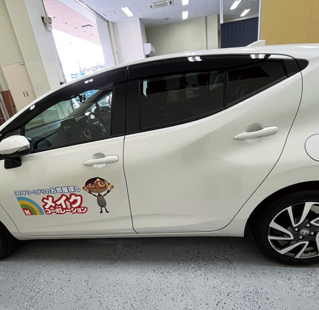施工前の車両は無地の白で、一見すると何の変哲もない普通の車でしたが、高品質なカーラッピングフィルムと精密な施工により、メイクコーポレーション様のカラフルなロゴとキャラクターが目を引くデザインへと生まれ変わりました。