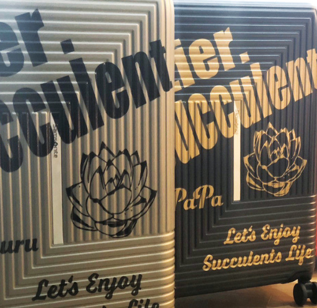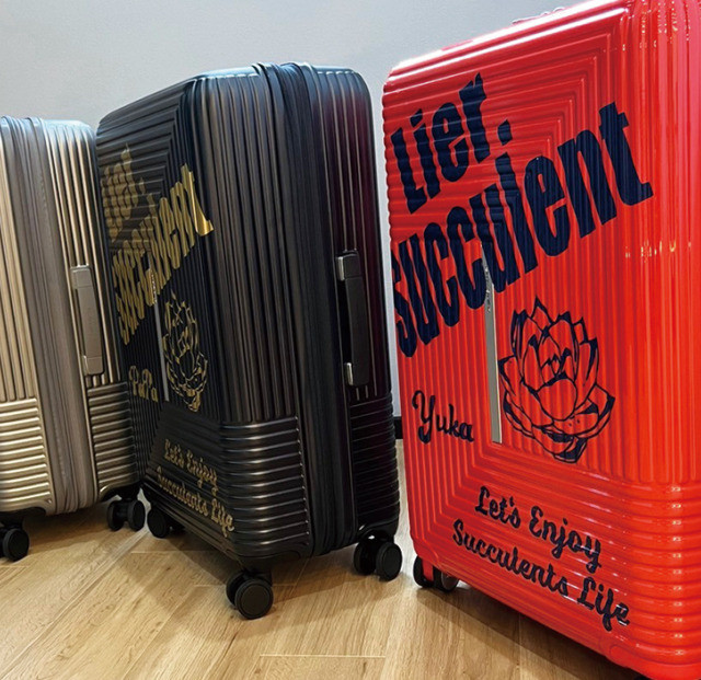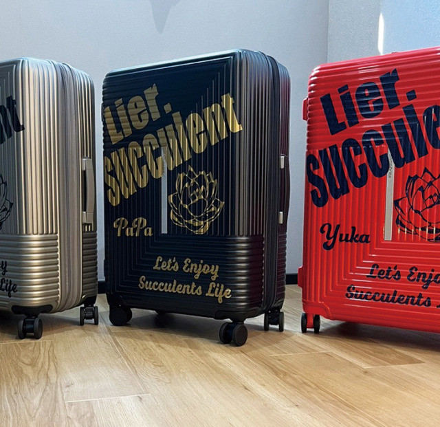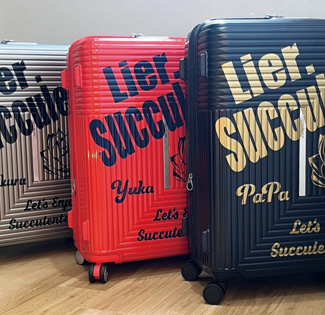 2024年3月6日、本田様のために特別にデザインされたカッティングシートを、丁寧に貼加工しました。多色展開のスーツケースに、それぞれ異なるカラーのシートを使用し、「Lier, Succulent」という独特なメッセージと多肉植物のグラフィックを施しました。