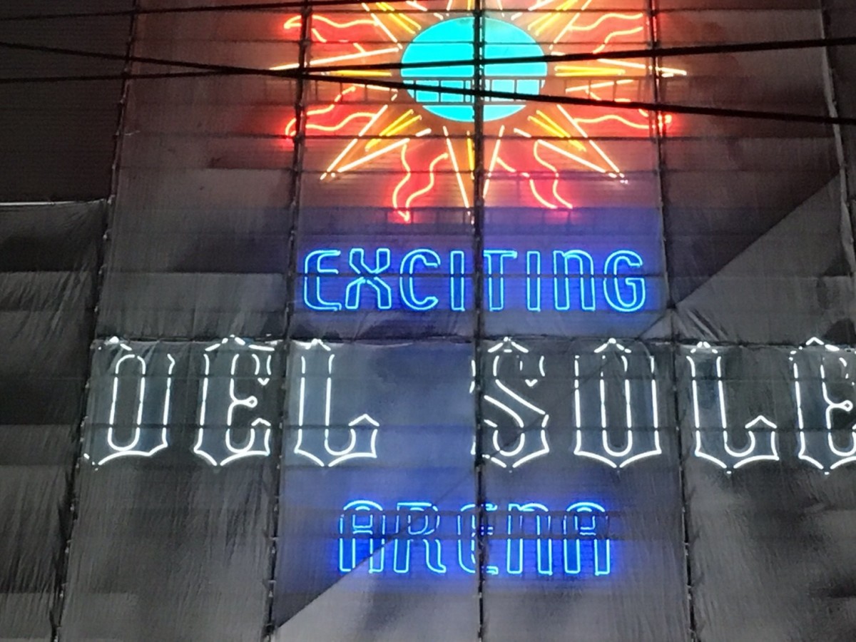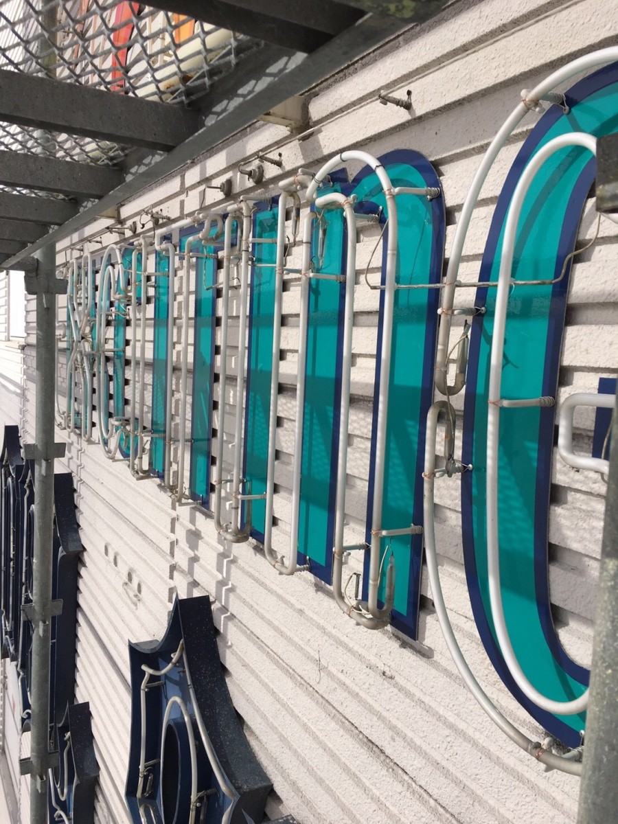 既存の光源やサインを取外があり、約30mの高所作業もありましたので、なかなか大変でしたが、