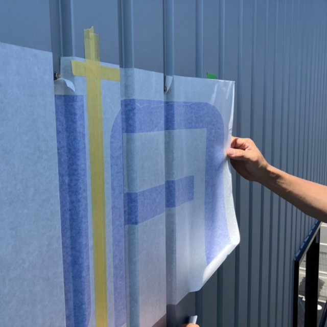 施工過程は、精密な計測と配置を要し、我々の技術者が手掛けた高い技術力が反映されています。はじめに、ロゴデザインを事前に設計し、カッティングシートを精密に切り出します。その後、壁面に直接貼り付ける前に位置調整を行い、最終的には丁寧にシートを固定しました。