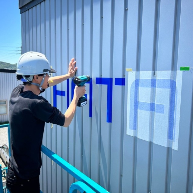 幡和工業株式会社の新しい工場の外壁に、カッティングシートを用いた切文字のロゴを施工しました。このプロジェクトは、2024年5月9日に北九州市若松区向洋町10-82にて行われ、工場のファサードを一新しました。使用したのは耐久性に優れた材質で、シンプルながらも目を引くデザインを施しました。