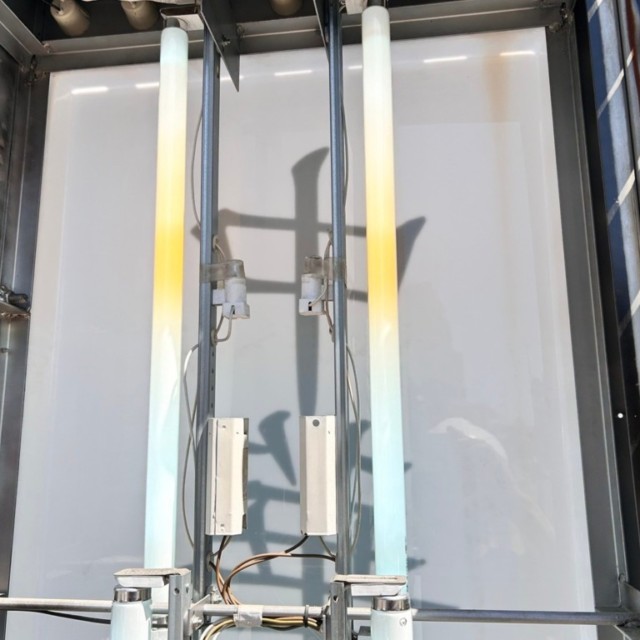 施工スタッフが脚立を使用しながらも安全に作業を進め、古くなった電球を丁寧に交換し、看板の内外部を清掃しました。
