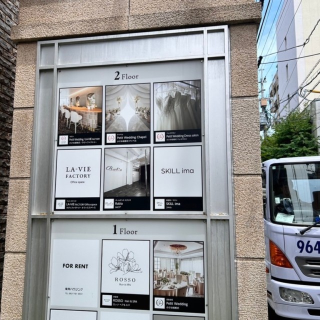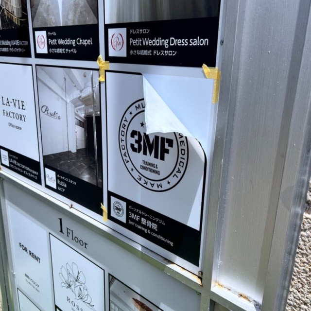 2024年6月21日、福岡市中央区大名にある花形館様のテナント様名称変更に伴い、出力シートの貼り替え施工を行いました。このプロジェクトでは、2階にある案内板および看板のデザインと表示内容を更新しました。