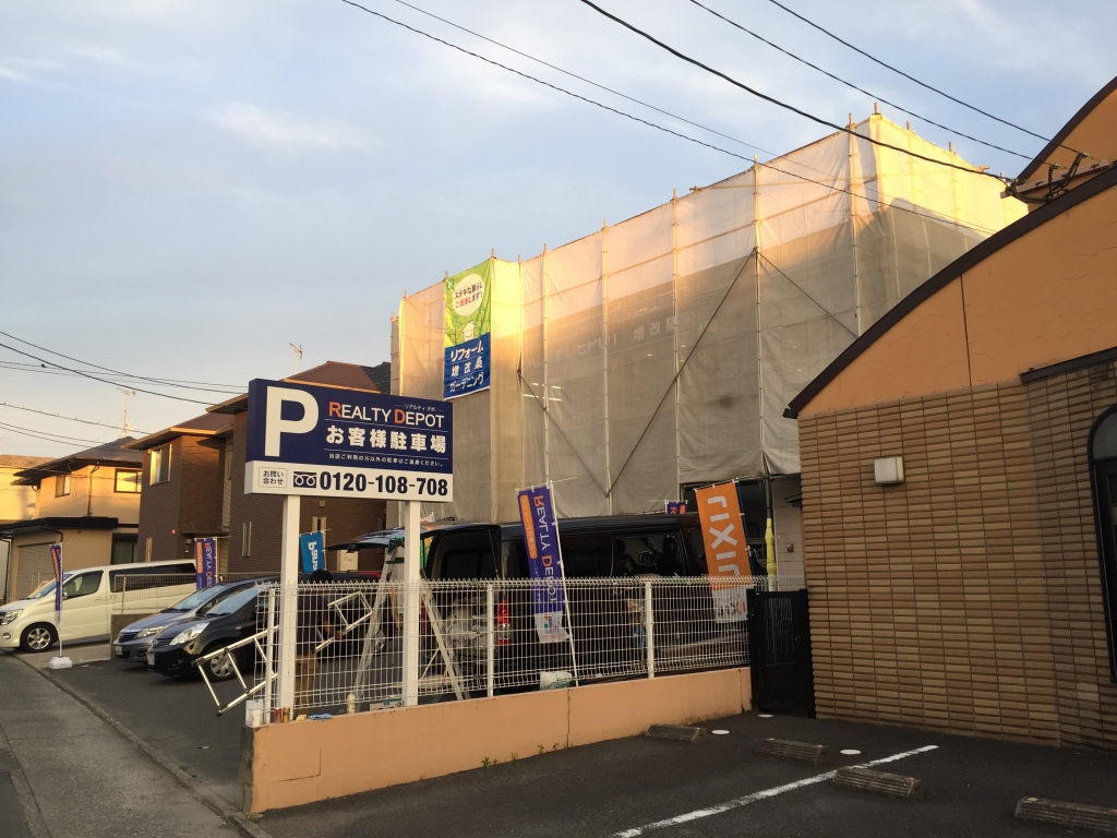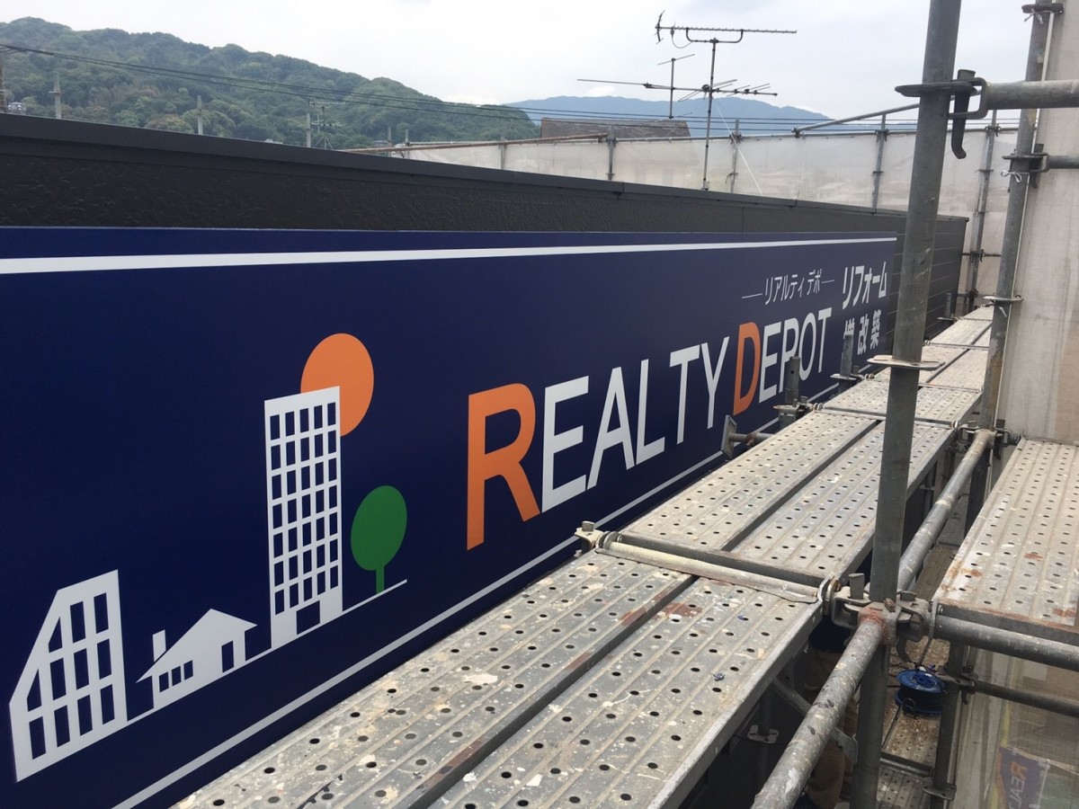 リアルティデポさんの壁面サインと独立看板の施工です。リアルティストアさんのリフォーム部門で、少し入った所に会社があるので、大きめのサインとご相談に来られるお客様用駐車場の案内サインをご依頼頂きました。